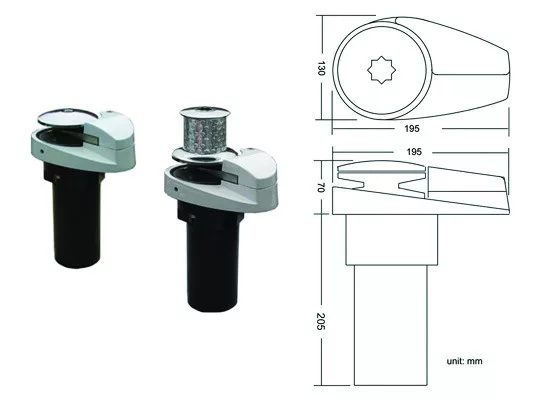 Sidrna vitel za vertikalno vgradnjo, primeren za sprejemanje verige in vrvi, v aluminijastem ohišju. Njegovo gibanje je nežno in gladko. Enostavna montaža, visoka nosilnost. V ceno so vključeni: krmilna enota, magnetni stikalo, ročni vitel. Za uporabo potrebujete tudi naslednje izdelke: izklopnik (2217-08), verigo po potrebi, boben za verigo (1861-08). 5) Parametri: Moč: 1100 vatov Napetost: 12 V Vlečna sila: 450 kg Nosilnost: 72 kg Velikost verige: 6 mm Hitrost vlečenja: 20 m/min Teža: 6,8 kg Optimalna velikost čolna: 8,5 - 12,5 m