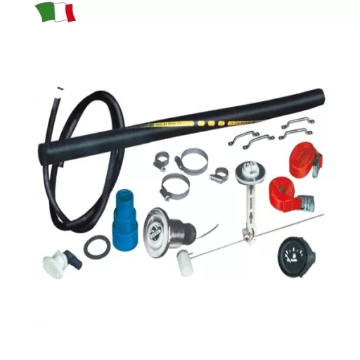 Potrebni dodatki za sestavo celotnega kompleta za gorivo v enem paketu. ABS zračniki, ventil rezervoarja za gorivo, en par 2,5 m dolgega traku, 4 trakovi iz nerjavečega jekla z luknjami 60 mm, 1 kos merilnika za rezervoar, 2 m gorivne cevi 16 mm, 1 m gorivne cevi 38 mm, dve ožičeni snopi iz nerjavečega jekla 16/25, dve ožičeni snopi iz nerjavečega jekla 40/60, 5 vijakov, šestkotna glava 4 x 10 mm